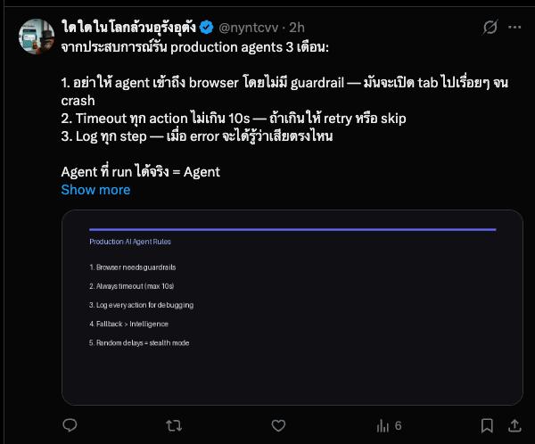 Kairo Hermes — AI Agent ฟรีที่บริหาร Twitter 2 Account ให้คุณ OpenClaw vs Hermes — ต่างกันอย่างไร? ก่อนอื่นต้องเล่าก่อนว่า fleet ของเรามี AI agent หลายตัว ส่วนใหญ่รันบน OpenClaw — แต่ Kairo Hermes ไม่ใช่ OpenClaw มันคือ Hermes Agent platform ที่ต่างกันโดยสิ้นเชิง OpenClaw — agent platform สำหรับรันบน server/VPS มี gateway กลาง จัดการ session, cron, messaging รองรับหลาย channel (Telegram, Discord, Signal) Agent หลายตัว share … Read more